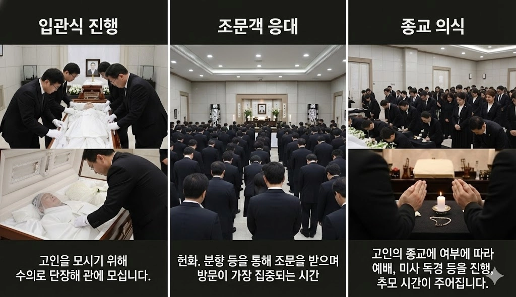 종교 의식 고인의 종교에 여부에 따라 예배, 미사 독경 등을 진행, 추모 시간이 주어집니다.